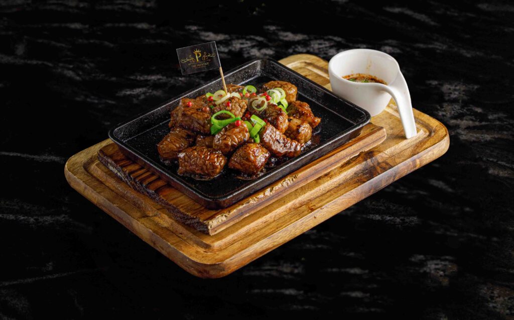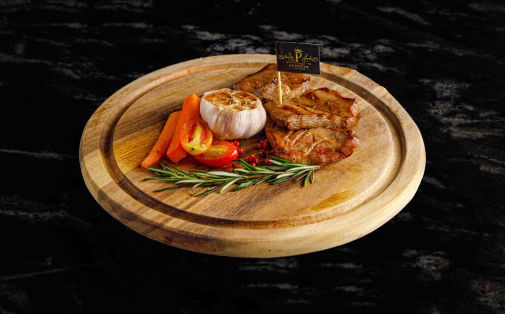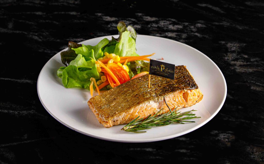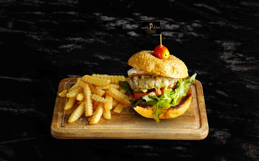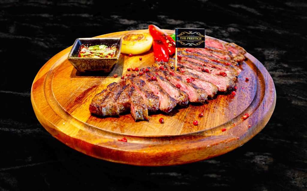 STEAK สเต็กเนื้อ BEEF STEAK ราคาตามน้ำหนัก. สเต็กซี่โครงแกะ GRILLED LAMB CHOPS 890.- สเต็กแซลมอนทาวเวอร์ SALMON STEAK TOWER 390.- สเต็กแซลมอน SALMON STEAK 320.- ลิ้นวัวย่าง GRILL BEEF TONGUE 300.- / 100g เนื้อกระทะร้อน HOT PLATE BEEF (ราคาตามน้ำหนัก) BURGER เดอะเพรสทีจ คิดเบอร์เกอร์ THEPRESTIGE KID BURGER 189.- / 100g เดอะเพรสทีจ บิ๊กเบอร์เกอร์ THEPRESTIGE BIG BURGER 259.- / 150g SOUP ซุปครีมเห็ด MUSHROOM CREAM SOUP 120.- APPETIZER เนื้อแดดเดียว SUN DRIED BEEF 170.- ปีกไก่BBQซอสเม็กซิกัน 890.- มันบด MASHED POTATO 150.- ขนมปังกระเทียม GARLIC BREAD 95.- มันฝรั่งเสี้ยวพระจันทร์ทอด POTATO WEDGES FRIES 100.- มันฝรั่งทอด FRENCH FRIES 100.- SALAD สลัดปลาทูน่า TUNA SALAD 200.- สลัดผักรวม MIXED VEGETABLE SALAD 160.- ซีซ่าร์สลัด CAESAR SALAD 195.- SINGLE DISH ข้าวราดผัดกะเพราเดอะเพรสทีจ STIR-FRIED HOLI BASIL WITH WAGYU BEEF ON RICE 245.- ข้าวผัดมันวากิว WAGYU BEEF FAT FRIED RICE WITH SUN DRIED BEEF 220.- ข้าวผัดปลาแซลมอล SALMON FRIED RICE 220.- ข้าวราดผัดกะเพราทะเล STIR-FRIED HOLI BASIL WITH SEAFOOD ON RICE 295.- STIR FRIES ผัดกะเพราเดอะเพรสทีจ STIR-FRIED HOLI BASIL WITH WAGYU BEEF 365.- ผัดกะเพราทะเล STIR-FRIED HOLI BASIL WITH SEAFOOD 365.- PASTA เฟตตูชินี่สตูว์แก้มวัว BEEF CHEEK STEW WITH FETTUCCINE 380.- ลาซานญ่าเนื้อ BEEF LASAGNA 300.- สปาเก็ตตี้ปลาเค็ม SPAGHETTI WITH SALTED FISH 250.- สปาเก็ตตี้โบโลเนส (เนื้อ) SPAGHETTI BOLOGNESE (BEEF) 250.- ต้มแซ่บน่องลาย BEEF FORESHANK SPICY SOUP 195.-